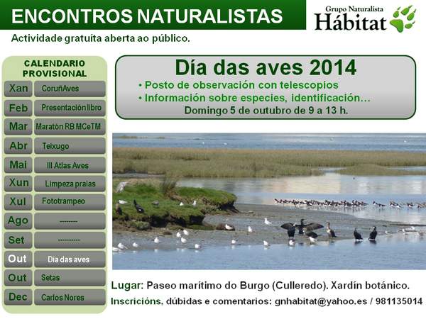 Para conmemorar o Día Mundial das Aves, o domingo 5 de outubro de 9 a 13 horas instalaremos un punto de información ornitolóxica no paseo marítimo do Burgo (Culleredo), á altura do xardín botánico.