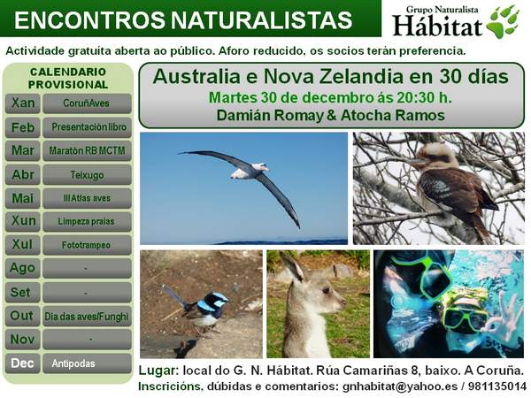 Xa que non poderemos gozar coa presenza de Carlos Nores por motivos familiares, o derradeiro Encontros Naturalistas de 2014 correrá a cargo de Damián Romay e Atocha Ramos, que farán unha presentación fotográfica da súa viaxe por Australia e Nova Zelandia.