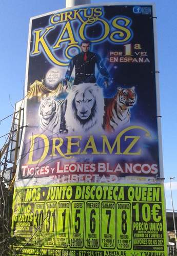 Circus_Kaos_CartelEsta semana atopamos máis un exemplo de maltrato animal, desta feita nas instalacións do Cirkus Kaos instalado no concello de Mos. A pesar de contar con un repertorio variado de malabaristas e pallasos, é un dos circos que se resiste a abandonar a utilización de animais. Animais forzados a vivir en condicións aberrantes para á súa natureza e adestrados para desenvolver actividades antinaturais para lecer dos humanos. O caso dos leóns é paradigmático, en lugar de estar na sabana africana terán que soportar en gaiolas minúsculas as xélidas noites desta semana.