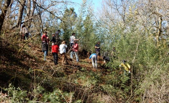A continuación, o grupo desprazouse ata a zona de traballo transportando a ferramenta necesaria. Alí comezaron as tarefas de eliminación. A pé de campo explicouse ao voluntariado cómo acometer a eliminación das partes aéreas e das raíces das mimosas que cubrían unha superficie de aproximadamente 1.000 m2. O traballo foi duro sobre todo polas condicións do terreo e pola pendente. Un grupo de voluntarios/as se dedicaron a eliminar as silvas (Rubus fruticosus) que dificultaban a eliminación das acacias. Porén, os traballos avanzaron rapidamente ao longo da mañá, e a hora de xantar á beira do río, máis da metade da mancha de A. dealbata estaba eliminada.