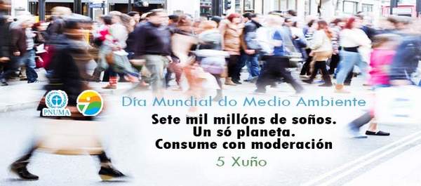 O vindeiro 5 de xuño as Nacións Unidas promoven a celebración do Día Mundial do Medio Ambiente baixo o lema “Sete mil millóns de soños. Un só planeta. Consume con moderación”. O tema escollido salienta que para 2050, de continuar as actuais pautas de consumo e produción, xunto co aumento da poboación a 9,6 mil millóns, precisaremos tres planetas para manter o noso modo de vida e consumo. Os datos amosan que as persoas estamos a consumir máis recursos naturais dos que o planeta pode proporcionar de forma sostible.