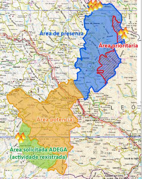 No caso do Courel o lume ten afectado aos montes comprendidos entre o Val de Louzará e a Serra da Trapa, nunha área para a que ADEGA ten solicitado a súa inclusión no Plano do Oso coma “área de presenza”, que nin tan sequera figura catalogada coma “área potencial”, malia a que nos dous últimos anos teñen acontecido varias incursións de osos nesta zona.