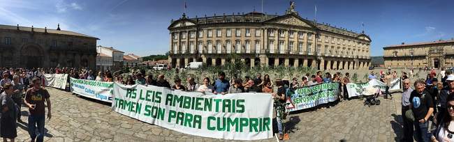 Hoxe eiquí nesta emblemática praza, queremos visibilizar a impunidade coa que os plantíos de eucalipto ocupan espazos de alto valor natural e patrimonial, perante o silenzo ou a colaboración cómplice da Xunta. Esta aparente desfeita, esta vergoñenta estampa non está moi lonxe do que arestora está a acontecer nos nosos Parques Naturais, na nosa Rede Natura, sobre os nosos xacementos arqueolóxicos, enriba das nosas terras produtivas, nas que troques de medrar alimentos medra a pasta de ENCE.