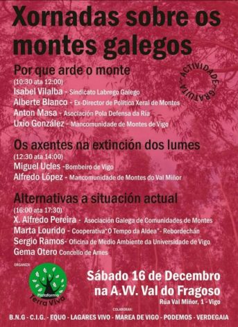 Convidámosvos a todas e a todos a participar nesta xornada que terá lugar o 16 de decembro na Asociación de veciños Val do Fragoso (Rúa Val Miñor, 1, Vigo), na que falarán diversas persoas representantes de distintos puntos de vista a respecto da natureza e do rural.
