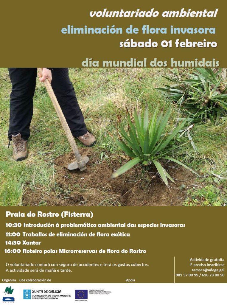 O sábado 1 de febreiro de 2020 desenvolverase unha acción de voluntariado ambiental para continuar coa loita contra as especies invasoras nas microrreservas de Fisterra. Convocamos ao voluntariado ambiental a participar nesta iniciativa e a coñecer este espazo de Fisterra cun elevado valor ambiental e diversidade botánica.