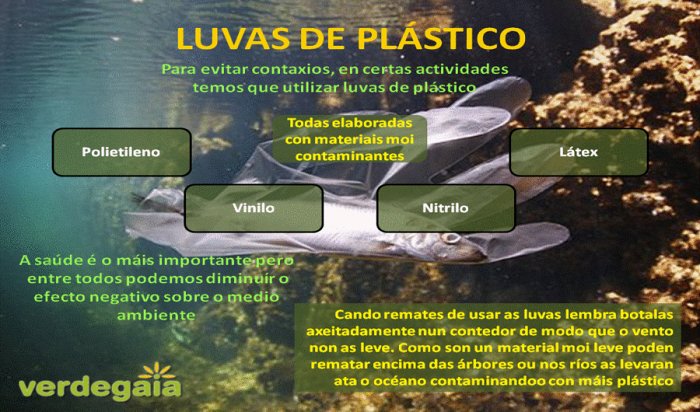 As luvas de plástico empregadas en supermercados, froiterías e gasolineiras están elaboradas con LDPE (Polietileno de baixa densidade) e dada a lixeireza que as caracteriza probablemente rematarán penduradas nas árbores ou no leito dos ríos que antes ou despois as transportarán ata o Océano colaborando dese modo a un dos principais problemas ambientais da actualidade como é a acumulación de plásticos nos océanos.