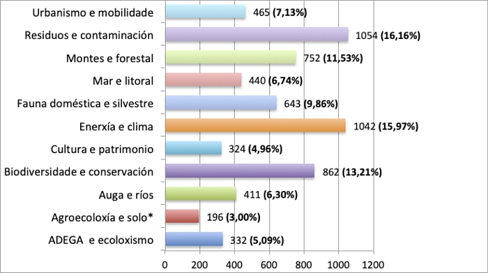 Atendendo ao número de rexistros anuais por temática, obsérvase que a categoría con máis rexistros é a de “residuos e contaminación”, con 1054, un 16,16% do total, seguida moi de preto por “enerxía e clima”, con 1042 entradas. En 2019, a problemática coa mina de Touro e os vertedoiros de refugallos, así como a celebración da Cimeira do Clima en Madrid colocaron estas dúas categorías entre as máis tratadas nos medios. O tópico “Biodiversidade e conservación” con 862 rexistros (13,21%), especialmente polos conflitos coa da caza, as especies invasoras (Vespa velutina) e a xestión dos espazos naturais (polémica co exceso de visitates ás Illas Atlánticas) está tamén entre os que máis novas producíu. Os lumes (categoría “montes e forestal”) rexistran tamén bastantes entradas neste ano (752), particularmemte nos meses de marzo e setembro.