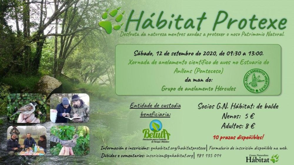 O vindeiro sábado, 12 de setembro do 2020, de 09:30 a 13h, tes unha nova cita con Hábitat Protexe! Nesta ocasión acompañaremos aos compañeiros do Grupo de anelamento Hércules nunha xornada de anelamento científico de aves, na súa estación de esforzo constante en Ponteceso. Unha oportunidade única para poder ver de preto o impagable traballo que levan a cabo os nosos grupos de anelamento para aumentar o coñecemento sobre as aves que nos rodean.