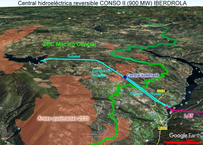 Iberdrola está a tramitar outro megaproxecto hidroeléctrico de 900 MW usando como “depósitos” os encoros de Cenza e Bao. Máis de 15 km de túneis, unha central en caverna a 600 m baixo o Macizo Central e millóns de m3 de entullo en plena RN2000…