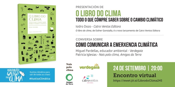 Verdegaia organiza, coa participación de Nais polo Clima, a presentación d’O Libro do Clima publicado por Catro Ventos editora que se realizará o xoves 24 de setembro ás 20h. por streaming.