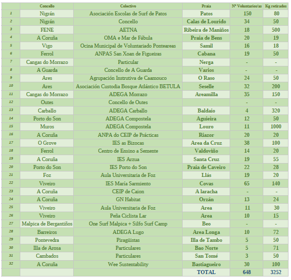 Como noutras edicións participaron centros de ensino, surfeiros, ONG ecoloxistas, asociacións culturais, de piragüistas, ciclistas, ANPAS e particulares. Todas e todos tiñan a mesma fin: limpar as súas praias e crear conciencia.