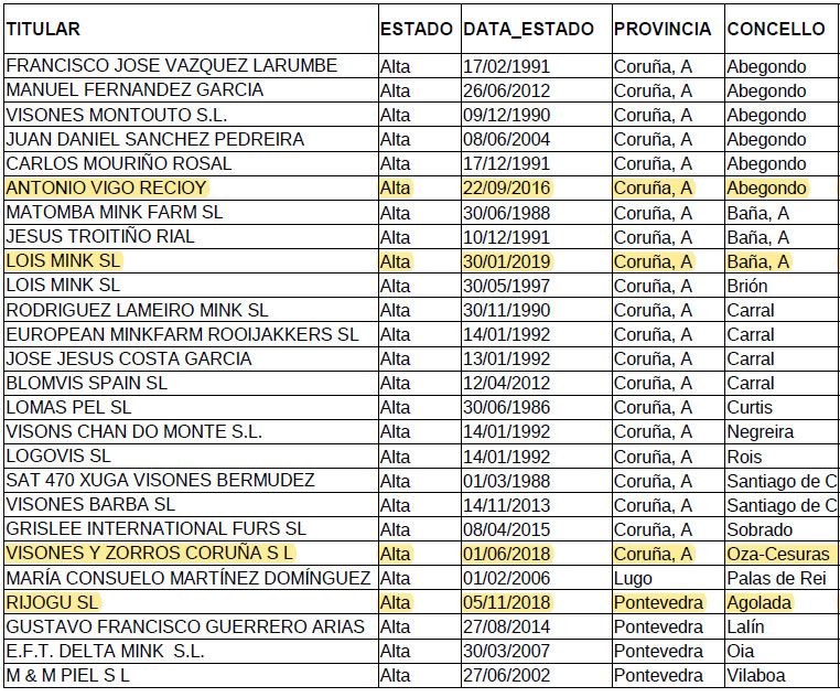 Na listaxe de granxas arestora activas figuran 4 instalacións con data de alta posterior a marzo de 2016. Daquela, unha sentenza da sala do contencioso-administrativo do Tribunal Supremo anulaba o apartado 2º da disposición adicional 6ª do Real Decreto 630/2013, de 2 de agosto, que regulamenta o Catálogo español de especies exóticas invasoras. Este apartado da norma facía referenza á posibilidade excepcional de autorizar o aproveitamento gandeiro de especies invasoras, establecendo ademais que para o visón americano (Neovison vison) non se poderían abrir novas granxas nin ampllar as existentes nos territorios nos que está presente o visón europeo (Mustela lutreola). En Galiza, ao contrario de por exemplo en Euskadi ou Navarra, a especie europea non está presente polo que antes deste fallo podían instalarse novas granxas e ampliar as xa operativas.