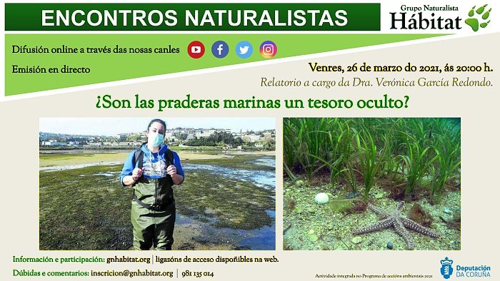 A emisión será este venres, 26 de marzo do 2021, ás 20:00h., baixo o título “¿Son las praderas marinas un tesoro oculto?”. Se queres participar como público poderás conectar libremente a través das nosas canles nas redes sociais, e facer as túas consultas por escrito a través destas mesmas redes. Rematada a conferencia, un moderador dará paso a un breve tempo de preguntas, atendendo na medida das posibilidades a todas aquelas que fosen enviadas.