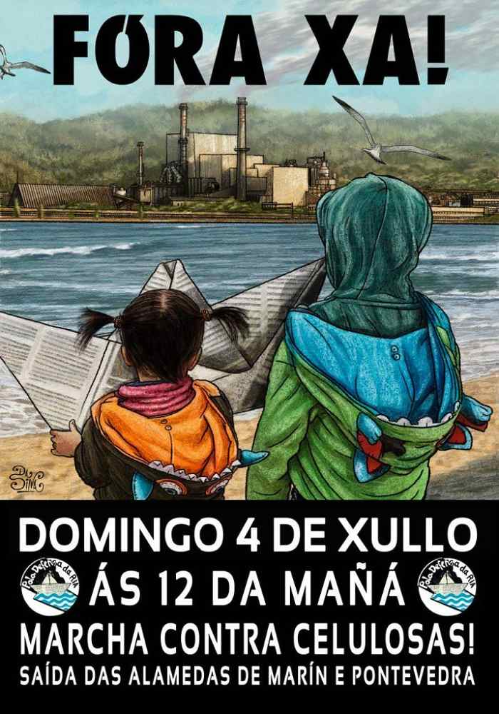Baixo o lema “FÓRA DA RÍA XA!”, unha nova MARCHA CONTRA CELULOSAS partirá das alamedas de Marín e Pontevedra na mañá do DOMINGO 4 DE XULLO para confluír diante das instalacións da ilegal empresa pasteira e esixir o cumprimento da lei e o peche definitivo e inmediato da súa actividade en Lourizán.