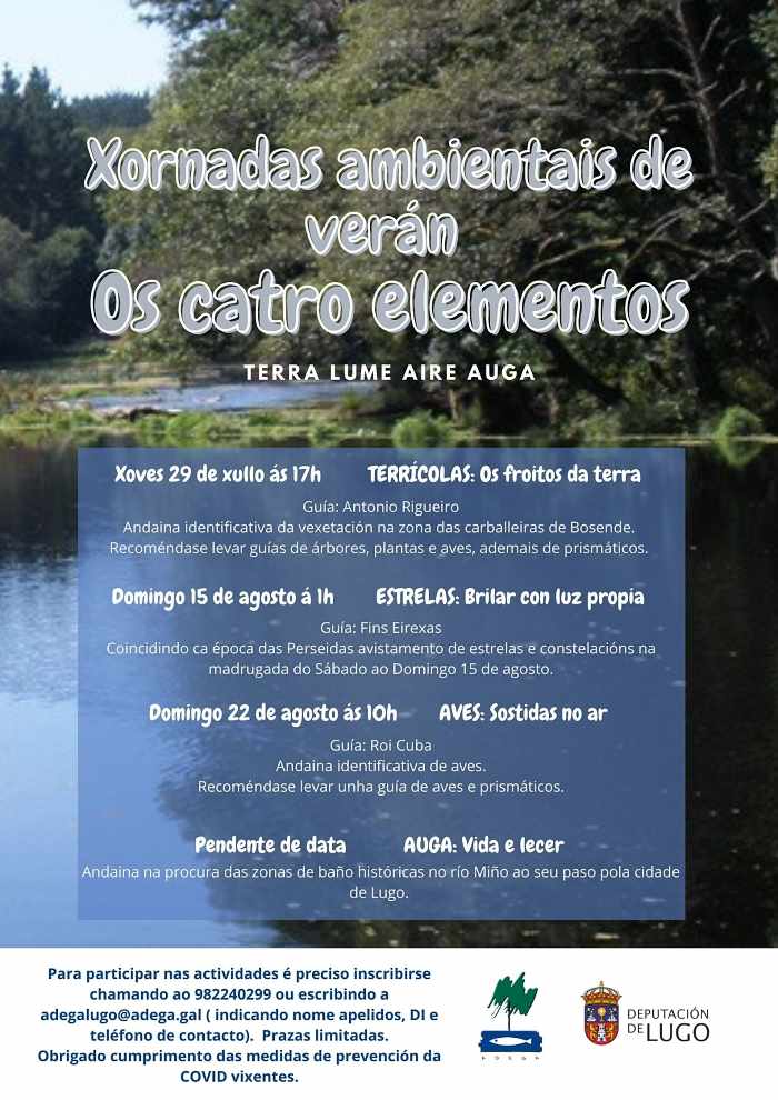 A cidade de Lugo acollerá un ano máis as xornadas de verán “Os catro elementos”, na que a través de andainas recoñeceremos a vexetación característica da zona de Bosende, as constelacións protagonistas do ceo nas noites de verán, as aves que habitan nos ceos da cidade e faremos un percorrido polas zonas de baño históricas da cidadanía de Lugo no río Miño.
