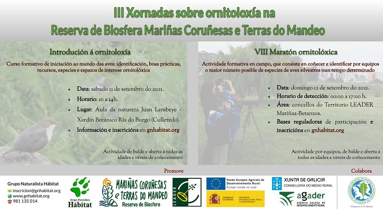 Gústanche as aves? Queres aprender sobre elas ou desfrutar dunha apaixonante xornada de campo tentando ver o maior número de especies nun só día? Pois xa agardámoste os vindeiros 11 e 12 de setembro, coas Xornadas sobre ornitoloxía na Reserva de Biosfera “Mariñas Coruñesas e Terras do Mandeo”. Coñecerás os mellores lugares para a observación de aves dentro da Reserva de Biosfera, como diferencialas, e pasarás dúas xornadas cheas de emocións, aprendizaxe e aves, moitas aves.