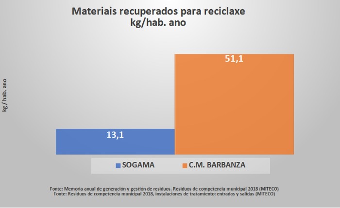 Facendo uso dos datos subministrados polo MITECO na súa Memoria anual de xeración e xestión de refugallos municipais do ano 2018, previo á pandemia, podemos comparar as cifras dos sistemas Barbanza e SOGAMA (figura lateral).