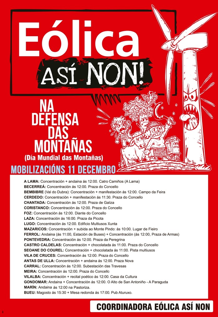 Máis de 170 colectivos, plataformas e entidades galegas de carácter ecoloxista, veciñal, social, cultural, sindical ou político que forman parte da coordinadora “Eólica Así Non” chaman a participar na multitude de accións descentralizadas por toda Galiza que se celebrarán o próximo sábado 11 de Decembro, día mundial das montañas, nunha grande mobilización fronte á actual invasión eólica.