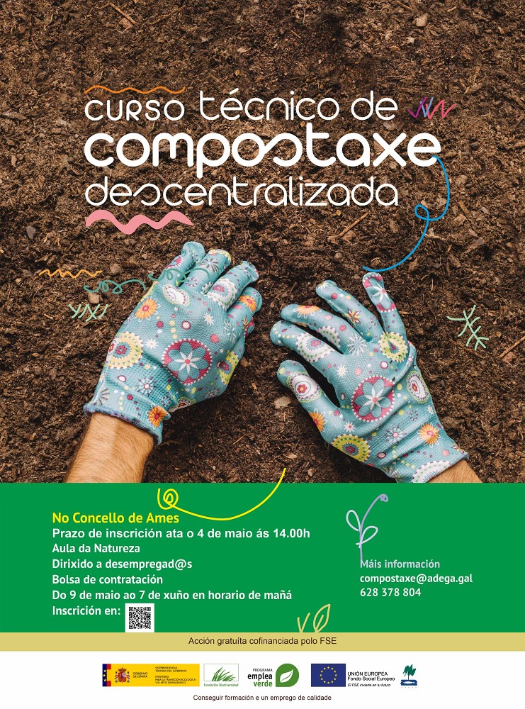 Ten unha duración de 100 horas presenciais, tanto teóricas como prácticas orientadas a controlar todos os aspectos dos proxectos de compostaxe descentralizada e xestión sustentable dos residuos. Dará comezo o 9 de maio ata o 7 de xuño en horario de mañá.