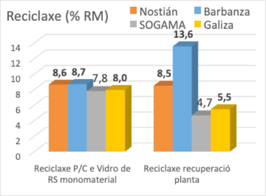 Unha análise polos diferentes ámbitos de xestión mostra como os tres ámbito están moi igualados en canto a recollida separada en orixe de P/C e vidro, o que achega un 8% de reciclaxe dos RM, de media a nivel galego. As diferenzas aparecen pola achega das plantas de tratamento (isto é, dos complexos medioambientais de SOGAMA, Lousame e Nostián), cunha achega media total á reciclaxe doutro 5,5% dos RM de Galiza, incluíndo residuos de envases e outras fraccións secas, a parte de vidro e P/C. Así, a reciclaxe atinxiu un total de 13,5% dos residuos en 2019. Mais en 2019 a achega de cada planta mostraba grandes diferenzas, con resultados moi pobres para SOGAMA (4,7% de todos os RM do ámbito), e máis positivos para Nostián (8,5%) e sobre todo para Barbanza (13,6%).