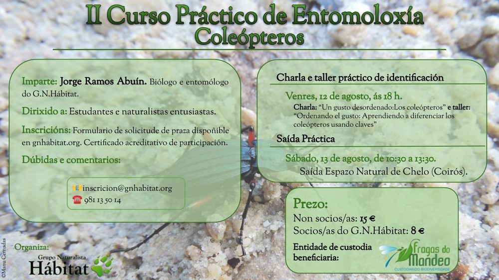 Charla e taller práctico de identificación: Venres, 12 de agosto, de 18h a 21h, terá lugar a charla teórica no local social do G.N.Hábitat cunha primeira parte co título: “Un gusto desordenado: Los coleópteros“, unha introdución a estes insectos, datos interesantes da súa bioloxía e da súa ordenación taxonómica. E unha segunda parte será unha Práctica baixo o título: “Ordenando el gusto: Aprendiendo a diferenciar los coleópteros usando claves”, onde Jorge Ramos, propoñerá unha serie de casos prácticos para ser identificados paso a paso e, desta maneira, familiarizarse coas clases dicotómicas para a identificación de coleópteros. Para esta parte se facilitará aos participantes unhas claves para facilitar a comprensión e identificación das diferentes familias destes insectos, os máis numerosos e diversos do planeta.