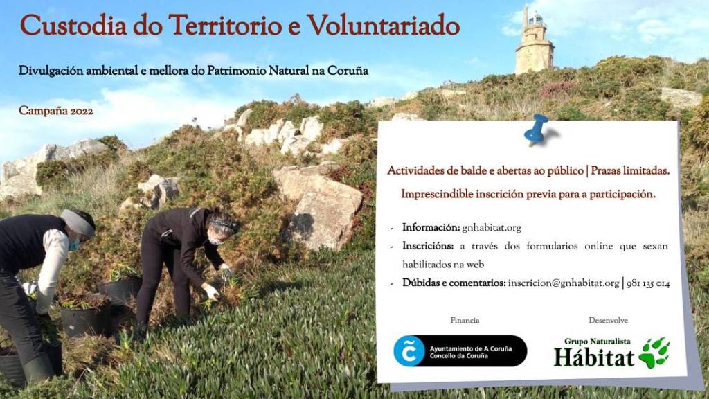 Por quinto ano consecutivo, encarando un lustro de actividades a prol do patrimonio natural da cidade, a Concellería de Medio Ambiente do Concello da Coruña e o Grupo Naturalista Hábitat retomamos a nosa colaboración no marco do programa “Custodia do Territorio e Voluntariado”. Unha iniciativa que acubilla, en cada campaña, diversas actividades dirixidas ao estudo, a divulgación e a conservación das áreas de interese ambiental da cidade da Coruña, con especial fincapé na contorna do Espazo Natural de Interese Local (ENIL) Torre de Hércules.