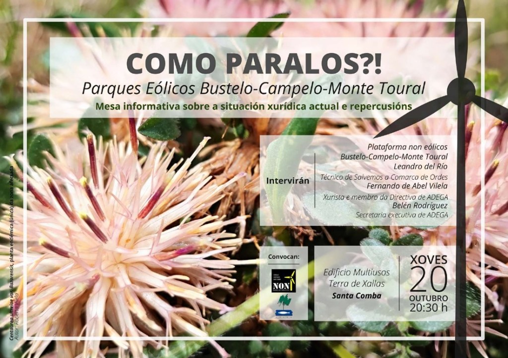 Paralelamente, iniciarase unha xeira de mesas informativas nas zonas afectadas polos tres proxectos eólicos recorridos de Greenalia que comezará o próximo xoves, 20 de outubro, en Santa Comba. O acto informativo titulado “Como paralos?!”, convocado por ADEGA e a Plataforma non eólicos Bustelo-Campelo-Monte Toural, estará dirixido ao público xeral con especial atención aos veciños e veciñas directamente afectadas. Comezará ás 20:30 horas no Edificio multiusos Terras do Xallas e contará coa intervencións de avogados das entidades recorrentes e membros de ADEGA, da Plataforma non eólicos Bustelo-Campelo-Monte Toural e de Salvemos a comarca de Ordes.