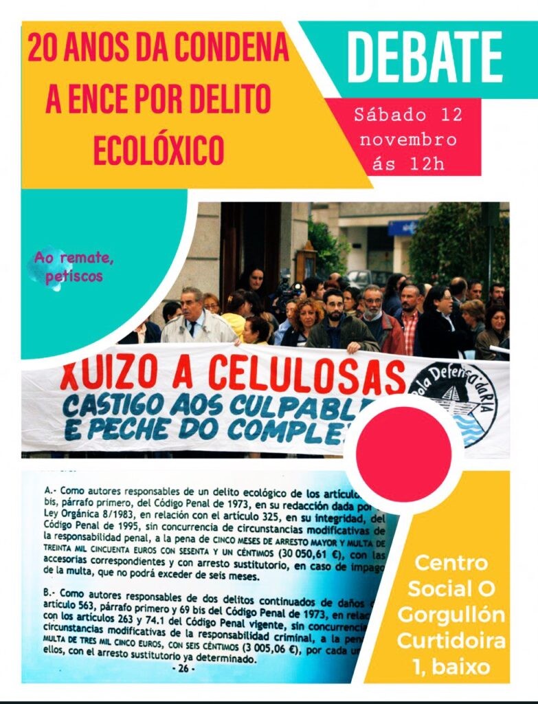 O vindeiro sábado 12 de novembro ás 12h no Centro Social Gorgullón (R/ Curtidoira nº 1 Baixo) falaremos e festexaremos co gallo do 20 aniversario do xuízo por Delito Ecolóxico contra ENCE pola súa Actividade Contaminante contra o medio e as persoas.