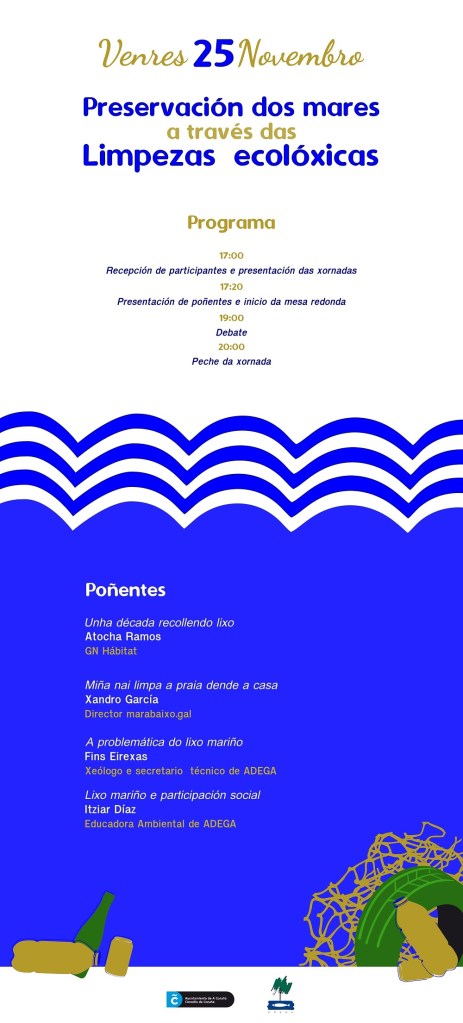 A xornada “Preservación dos mares a través das limpezas ecolóxicas” terá lugar o sábado, 25 de novembro, no local da Asociación Cultural de Alexandre Bóveda, sito na Rúa Olmos da Coruña, de 17.00h a 20.00h.