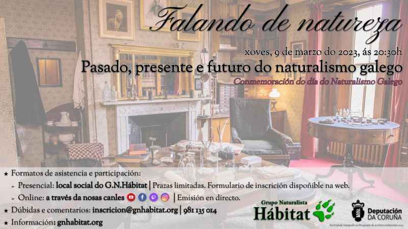 O vindeiro xoves 9 de marzo celebramos o noso primeiro día do naturalismo galego, e que mellor xeito de facelo que conversando entre naturalistas nun “Falando de natureza”. Rodeados de compañeir@s de paixón, debateremos sobre o pasado, presente e futuro do naturalismo en Galicia. Naturalistas de todas as idades contarannos as súas vivencias, anécdotas, inquedanzas e perspectivas de futuro.