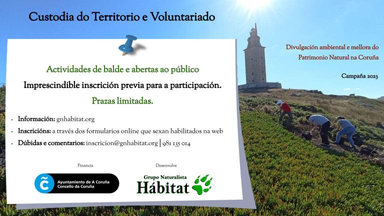 Por sexto ano consecutivo, e superando xa o lustro de actividades a prol do patrimonio natural da cidade, a Concellería de Medio Ambiente do Concello da Coruña e o Grupo Naturalista Hábitat traballamos para retomar a nosa colaboración no marco do programa “Custodia do Territorio e Voluntariado”. Unha iniciativa que acubilla, en cada campaña, diversas actividades dirixidas ao estudo, a divulgación e a conservación das áreas de interese ambiental da cidade, con especial fincapé na contorna do Espazo Natural de Interese Local (ENIL) Torre de Hércules.