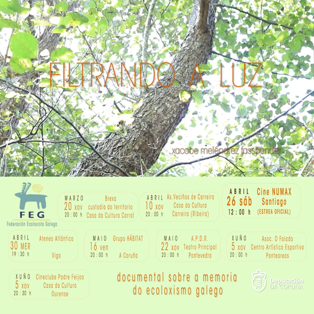 Xa está en difusión o documental Filtrando a Luz dirixido por Xacobe Meléndrez Fassbender sobre a historia do movemento ecoloxista galego vinculado á Asemblea de Grupos Ecoloxistas e Naturalistas de Galiza-Federación Ecoloxista galega. Fai un repaso pola historia do movemento nos últimos 50 anos.