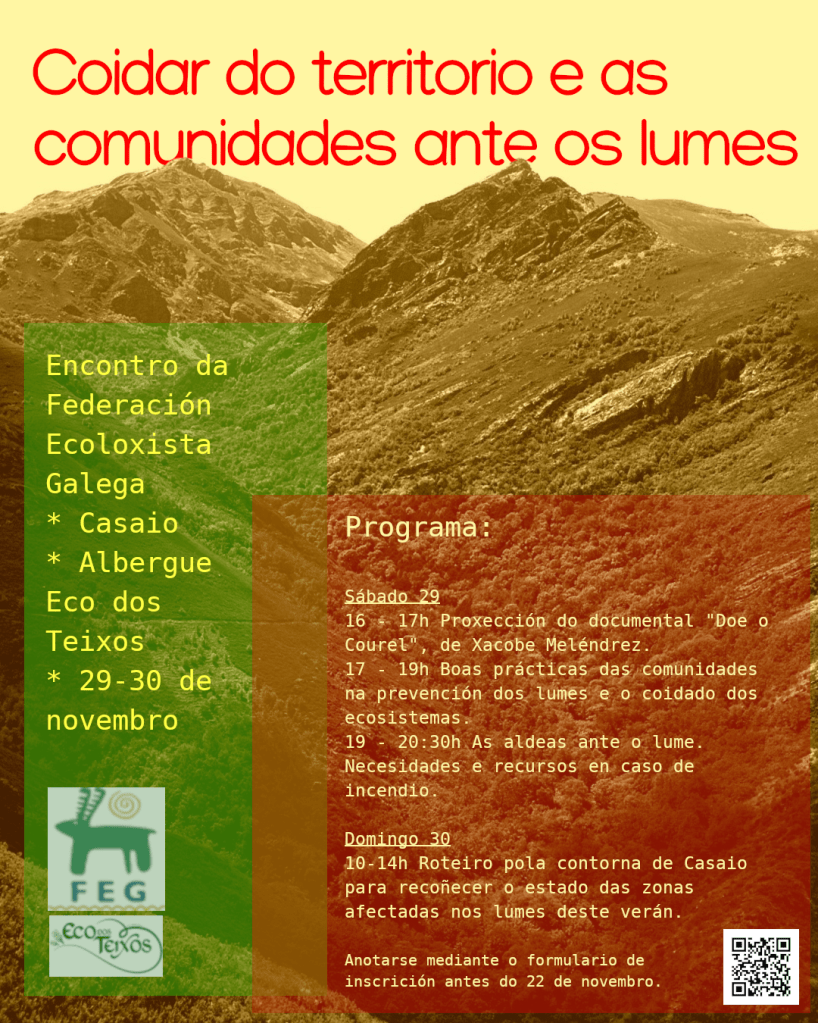 O último fin de semana de Novembro, 29 e 30, a Federación Ecoloxista Galega promove un encontro arredor da problemática dos lumes en Casaio (Carballeda de Valdeorras), no albergue e centro de actividades Eco dos Teixos. Como xa fixeramos despois da vaga de lumes que afectou á contorna do Courel en 2022, impulsamos este espazo co obxectivo de compartir inquedanzas, coñecementos, experiencias, recursos, demandas, etc. Tratamos de xuntar todo aquilo que poden achegar os colectivos ecoloxistas e as comunidades locais.